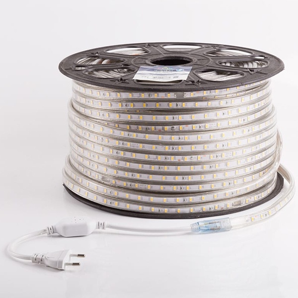 Лента работает от напряжения 220 В и имеет класс защиты IP67, что делает ее устойчивой к воде и пыли. Благодаря этому светодиодную ленту можно использовать как внутри помещений, так и на улице.