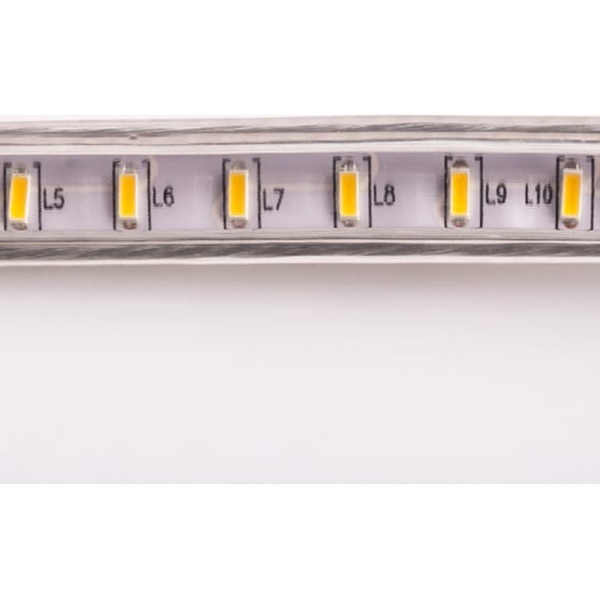Лента работает от напряжения 220 В и имеет класс защиты IP67, что делает ее устойчивой к воде и пыли. Благодаря этому светодиодную ленту можно использовать как внутри помещений, так и на улице.