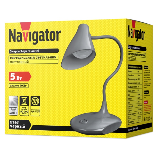 Светодиодный настольный энергосберегающий светильник Navigator мощностью 5 Ватт, нейтральный белый свет, черный корпус 14225