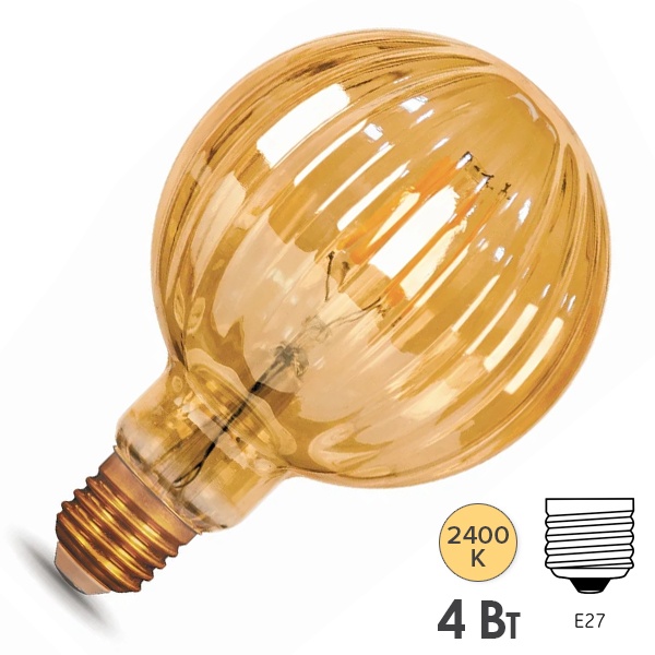 Филаментная, декоративная лампочка шар Гаусс, мощностью 4 Ватта с цоколем E27, теплый свет, золотистая колба 147802004