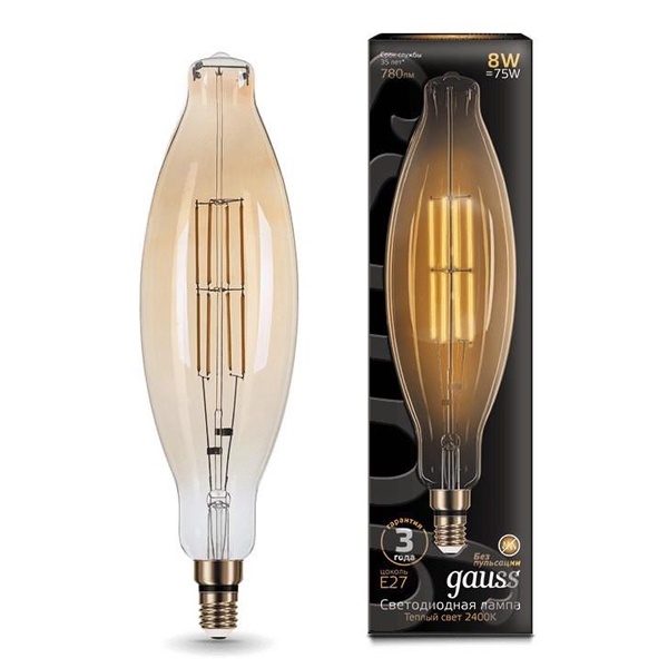 Филаментная ретро лампочка Гаусс с нитевидными светодиодами в золотой колбе, мощностью 8 Ватт, с цоколем E27, теплый свет 155802008