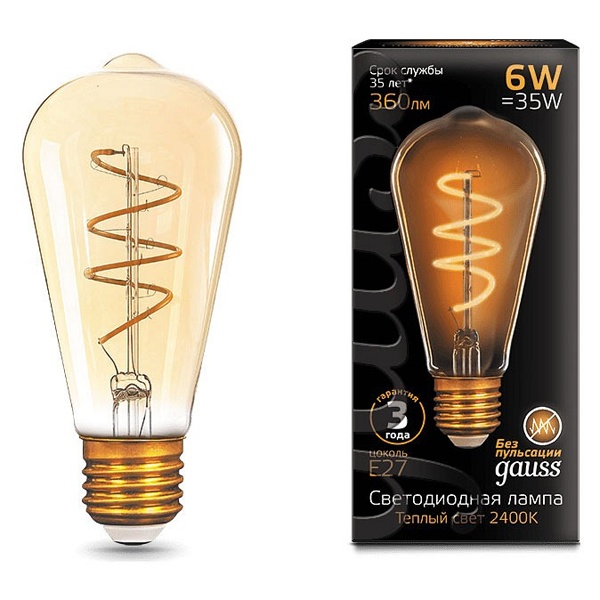 • Лампа филаментная светодиодная Gauss ST64 6W 2400K E27 360Lm золотой спираль