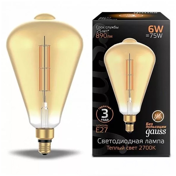 • Лампа филаментная светодиодная Gauss ST164 6W 2700K E27 890Lm золотой прямая нить