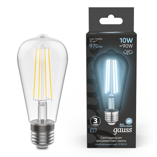 Светодиодная ретро-лампочка ST64 Гаусс, мощностью 10 Ватт(970лм), с цоколем E27, белый свет 4100К, прозрачная колба 157802210