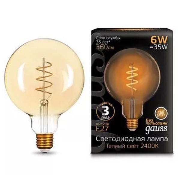 Филаментная ретро-лампочка G120 Гаусс, мощностью 6 Ватт, с цоколем E27, теплый свет, прозрачная колба 158802008