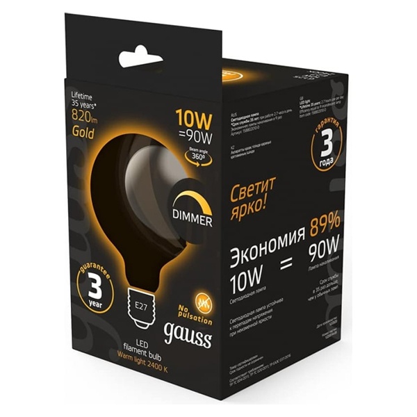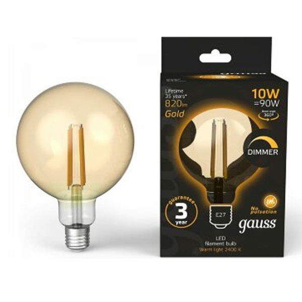 • Лампа светодиодная филаментная диммируемая Gauss G125 10W 2400K Е27 820Lm золотой