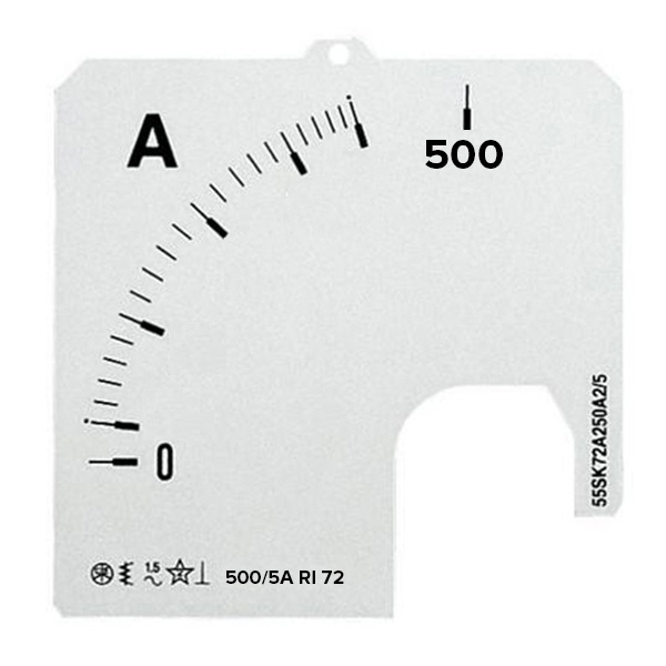 Абсолютно любой аналоговый амперметр оснащен шкалой, на которой отображаются соответствующие значения измерений силы тока. Данная модель от известной торговой марки ABB представляет собой измерительную панель, встраиваемую в амперметр с квадратным вырезом 72х72 мм. Это плоская шкала с нулевым положением имеет максимальный диапазон измерений до 500 Ампер. Она градуирована в амперах и имеет шаг 10 Ампер. Также на циферблате есть участок превышения тока. Измерительная панель имеет одностороннее направление, ось с указателем расположена в нижнем правом углу прибора. Максимальный угол отклонения стрелки составляет 78°.