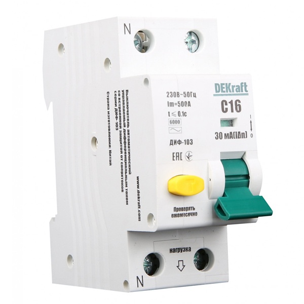 Автоматический выключатель дифференциального тока серии ДИФ-103 DEKraft; 1P+N; ном.ток 6 А; характеристика C; откл.способность Icn = 6 kA; ток утечки 30 мА; тип - АС; блок дифф.защиты – электронный; ширина – 2 мод. х 18 мм; монтаж – на DIN-рейку. АВДТ применяются в сетях напряжением до 220 В пер.тока для защиты человека от поражения электрическим током и электроустановок от сверхтоков и токов утечки. Аппараты ДИФ-103 являются более компактным вариантом АВДТ по сравнению с серией ДИФ-101.