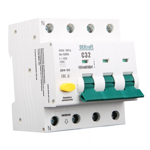 Это устройство из серии модульного оборудования DEKraft ДИФ-103 торговой компании Schneider Electric представляет собой автоматический выключатель дифференциального тока, который обладает отключающей способностью в 6000 Ампер, относится к классу устройств A с 4-мя полюсами: 3П+Н. Его цель состоит в защите электрических цепей от токов утечки, перегрузок и короткого замыкания. Обладая чувствительностью в 100 милиампер, АВДТ обеспечивает минимизацию риска возникновения пожара при повреждении электроустановки. Аппарат с четырехмодульной шириной рассчитан на номинальный ток 16 Ампер при рабочем напряжении трехфазной сети 415 Вольт переменного тока. Устройство класса А используется для защиты как от синусоидальных, так и от пульсирующих постоянных токов утечки. Мгновенное срабатывание расцепителя соответствует кривой C. На лицевой части корпуса имеется рычаг управления с индикацией положения контактов. Тестовая кнопка способствует регулярной проверке АВДТ, отражая его работоспособность. Крепление осуществляется на DIN-рейку с помощью простой защелки. Сечение подключаемых проводов – 25 мм2. Габаритные параметры: ширина – 72 мм, высота – 85 мм, глубина – 80 мм. Такой аппарат применяется в распределительных щитах, ВРУ и силовых установках в общественных, административных и производственных зданиях.