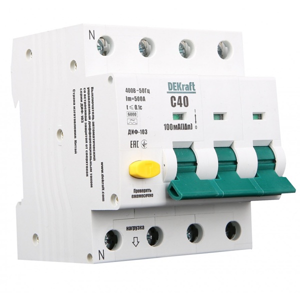 АВДТ класса А серии ДИФ-103 от производителя DEKraft Schneider Electric представляет собой устройство со встроенной защитой от сверхтоков, которое используется в трехфазных электросетях переменного тока с частотой 50 Герц и напряжением до 415 Вольт. Оно выполняет защитную функцию и обеспечивает 3 типа защиты: от короткого замыкания, перегрузок и возникновения утечки тока. Принцип действия: обнаружение дифференциального тока, сравнение с током срабатывания и отключение защищаемой цепи при превышении заданного значения. Данная модель рассчитана на токовую нагрузку 16 Ампер и обладает чувствительностью в 300 милиампер. Она гарантирует безопасность зданий и оборудования и предотвращает возникновение пожара при нарушении работы электроустановок. АВДТ обладает высокой коммутационной способностью в 6000 Ампер и уставкой типа C. Компактный прибор с 4-мя полюсами 3Р+N имеет и шириной 4 модуля крепится на DIN-рейку. На лицевой части есть тестовая кнопка для периодической проверки работоспособности дифавтомата, а также рукоятка управления с 2-мя позициями и индикацией положения контактов. Аппарат класса А защищает от пульсирующих и синусоидальных переменных токов утечки и применяется в цепи, к которой подключены бытовые электроприборы. Областью применения выступают распределительные щиты и силовые установки в административных, производственных и жилых зданиях. Габаритные параметры: ширина – 72 мм, высота – 85 мм, глубина – 80 мм.