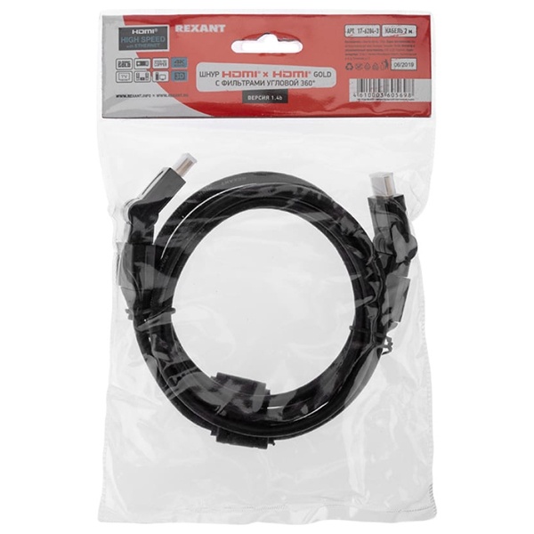 Шнур HDMI - HDMI gold 2М с фильтрами угловой 360° REXANT предназначен для передачи цифровых видеоданных высокого разрешения и многоканальных цифровых аудиосигналов с защитой от копирования. Используется для подключения во многих устройствах нового поколения: телевизионных аппаратах, компьютерах и ноутбуках, мультимедийных проигрывателях, игровых консолях, видеокамерах и других видеоустройствах имеющих соответствующий разъём. Отличительной особенностью является наличие ферритовых фильтров, которые увеличивают индуктивность проходящего через него участка провода в несколько сотен раз, это обеспечивает подавление помех высокой частоты. Ферритовые кольца на шнуре используются как дополнительные внешние фильтры, наличие которых гарантирует соблюдение всех стандартов качества и позволяет добиться: