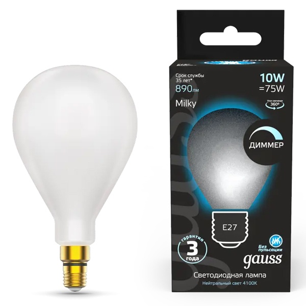 Филаментная диммируемая лампочка Гаусс грушевидной формы, с нитевидными светодиодами, мощностью 10 Ватт, нейтральный белый свет, с цоколем E27, матовая колба 179202210-D