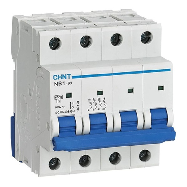 Автоматический выключатель нового поколения от известного производителя электротехнической продукции CHINT относится к серии модульных устройств NB1-63. Это компактный и современный агрегат, который обеспечивает защиту распределительных и групповых электрических цепей от превышения максимально разрешенного рабочего тока и токов короткого замыкания. Также такой прибор позволяет выполнять разрыв цепи вручную, если возникнет такая необходимость. Он рассчитан на работу в сети с напряжением 400 Вольт частотой 50 Герц при нагрузке номинального тока 6 Ампер. Автомат разработан с учетом последних тенденций в энергетике и оборудован окном индикации, позволяющим следить за состоянием контактов. Имеет белый корпус из прочного термостойкого пластика и синюю рукоятку с двумя положениями: I/O. Данная модель с 4 полюсами обладает универсальным применением и устойчива для эксплуатации в экстремальных условиях. Она способна выдерживать диапазон температур: от -35 до +40 градусов Цельсия. Отключающая возможность составляет 6 килоампер, что свидетельствует о надежности аппарата. Стойкость к износу электрической части – 4 тысячи циклов, механической части – 20 тысяч циклов. Тип электромагнитного расцепителя соответствует характеристике срабатывания C , обладающий высокой чувствительностью при КЗ , и рекомендован для защиты цепей большой протяженности с подключенными розетками или приборами освещенности. Габариты: 72х86х78 мм. Он служит для комплектации систем электроснабжения на объектах гражданского строительства и коммерческой недвижимости. Быстро и надежно крепится на монтажную рейку. Контактная группа выполнена для подключения двух типов шин, PIN и FORK.