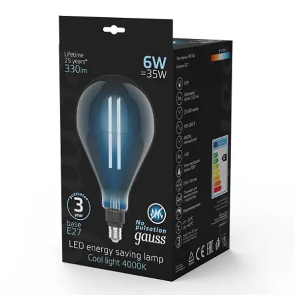 • Лампа филаментная светодиодная Gauss PS160 6W 4200K E27 330Lm серый прямая нить
