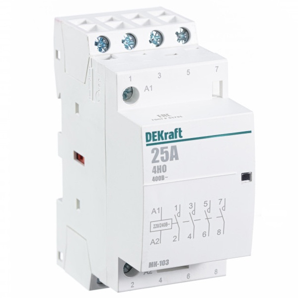 Модульный контактор серии МК-103 DEKraft; ном.ток 25 А (АС-7а); кол-во и исполнение контактов – 4НО; напряжение управления 220 В пер.тока; ширина – 2 мод. х 18 мм; установка – на DIN-рейку. Контакторы МК-103 применяются в сетях напряжением до 400 В пер.тока для дистанционного управления небольшими нагрузками, требующими большого количества включений / отключений, например, насосы, системы вентиляции и т.п. Модульные контакторы не требуют дополнительных настроек и специального обслуживания.