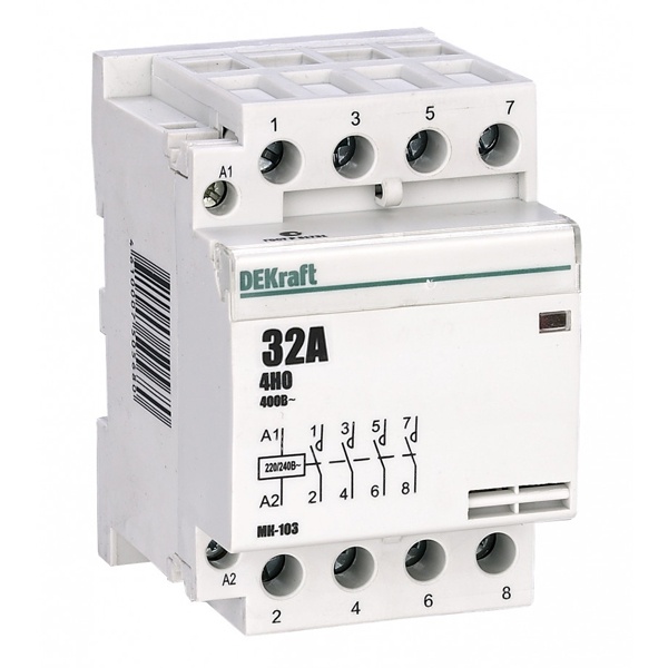 Модульный контактор серии МК-103 DEKraft; ном.ток 32 А (АС-7а); кол-во и исполнение контактов – 4НО; напряжение управления 220 В пер.тока; ширина – 3 мод. х 18 мм; установка – на DIN-рейку. Контакторы МК-103 применяются в сетях напряжением до 400 В пер.тока для дистанционного управления небольшими нагрузками, требующими большого количества включений / отключений, например, насосы, системы вентиляции и т.п. Модульные контакторы не требуют дополнительных настроек и специального обслуживания.