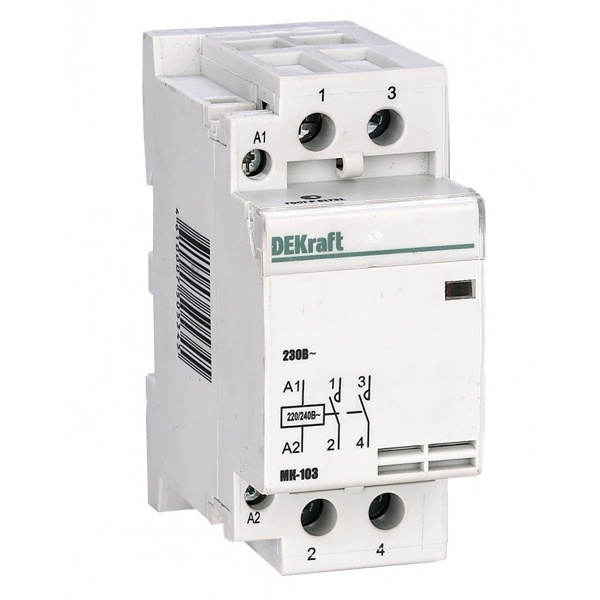 Модульный контактор серии МК-103 DEKraft; ном.ток 63 А (АС-7а); кол-во и исполнение контактов – 2НЗ; напряжение управления 220 В пер.тока; ширина – 3 мод. х 18 мм; установка – на DIN-рейку. Контакторы МК-103 применяются в сетях напряжением до 400 В пер.тока для дистанционного управления небольшими нагрузками, требующими большого количества включений / отключений, например, насосы, системы вентиляции и т.п. Модульные контакторы не требуют дополнительных настроек и специального обслуживания.