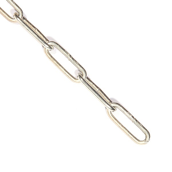 Сварная, длиннозвенная оцинкованная цепь из углеродистой стали. Цепь имеет большую степень свободы за счёт длинных звеньев. Может применяться в качестве такелажной оснастки или элементов декоративных конструкций различного назначения.