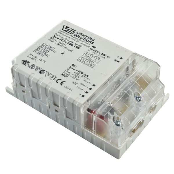 Блоки питания для светодиодных светильников. Безвинтовые контактные зажимы. Эффективность: >90 %. В зависимости от типа с/без выбора выходного тока. Защита от импульсных перенапряжений: до 1 кВ (L и N), до 2 кВ (L/N и PE). Защита от короткого замыкания, перегрева, от режима холостого хода.
