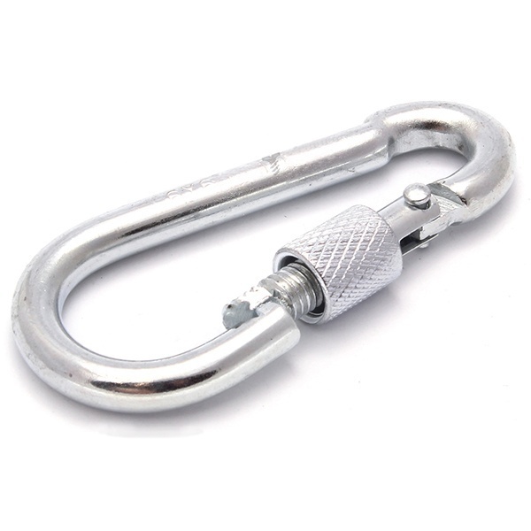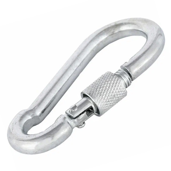 Стальной карабин DIN 5299D с винтовой муфтой (фиксатором) используется для быстрого и надежного крепления тросов и цепей между собой или к чему-либо. Карабин оснащён пружинной защёлкой и специальной стопорной муфтой, не дающей им самопроизвольно открываться и обеспечивает достаточную прочность конструкции карабина. Размер карабина c фиксатором определяется по диаметру поперечного сечения проволоки (прутка).