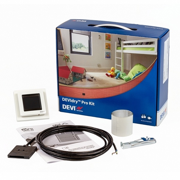 Devidry ProKit от известной компании Devi представляет собой набор для подключения и управления нагревательными матами Devidry 100. Комплект включает в себя электронный терморегулятор Devireg Touch белого цвета с датчиком температуры пола на проводе, кабель длиной 3 м для подключения к мату, ключ для разъемов и алюминиевую липкую ленту. Нагревательный мат с теплоизолятором используется внутри помещений для комфортного подогрева поверхности пола и применяется только для сухой установки под паркет, ламинат или ковровое покрытие. Он изготавливается как многослойная конструкция, включающая тонкий одножильный нагревательный кабель, закрепленный на алюминиевой фольге, и подложку из вспененного пластика, служащую дополнительной тепло- и звукоизоляцией. По краям мата расположены специальные разъемы для подключения матов друг к другу. Монтаж комплекта должен производиться квалифицированным специалистом. Датчик и электронный терморегулятор устанавливаются на стене и подключаются с помощью кабеля к мату.