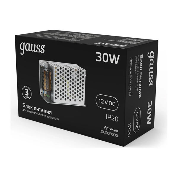 Понижающий блок питания 220/12 Вольт для светодиодных ламп мощностью 30 Ватт, Gauss Strip. 202003030