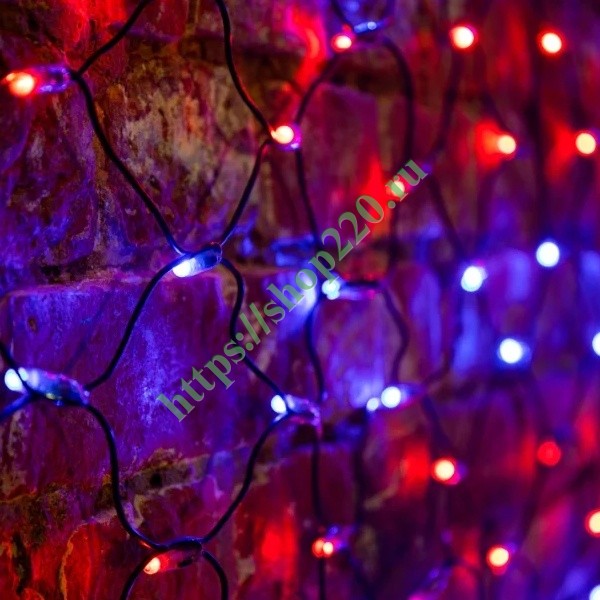 Гирлянда-сеть представляет из себя конструкцию в виде прямоугольника размером 2*1,5 метра, разбитого на равные ромбы, в углах которых находятся диоды красного и синего цвета, причем диоды чередуются по линии. Гирлянда имеет степень влагозащиты IP44 и ПВХ провод черного цвета, что позволит вам быстро и выгодно решить вопрос с декоративным украшением любых объектов как внутри помещения, так и снаружи. В комплекте идет контроллер с 8 режимами свечения, что позволяет гирлянде работать в динамике. Данная гирлянда используется для украшения фасадов и потолков зданий практически любой площади, отлично подходит для украшения небольших кустов, растяжки между направляющими в беседке или веранде, ей можно легко и быстро обмотать колонны или столбы, служит красивым декором окон зданий. Гирлянда-сеть имеет самое лучшее отношение цены к площади декорирования относительно других гирлянд, что делает ее уникальной в своем роде.
