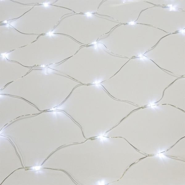 Гирлянда-сеть представляет из себя прозрачное полотно в виде квадрата размером 1,5*1,5 метра, разбитого на равные ромбы, в углах которых находятся диоды белого цвета.