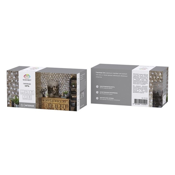 Гирлянда-сеть при использовании на окнах или других поверхностях позволяет осуществить равномерную засветку по всей площади, для этого достаточно ее растянуть по периметру, используя, например, присоски с крючком.