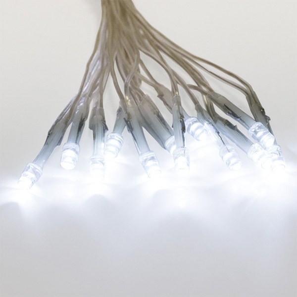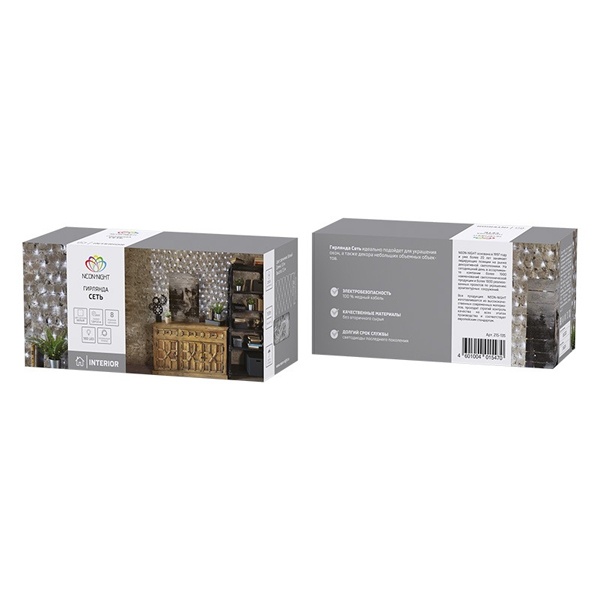 Гирлянда-сеть представляет из себя прозрачное полотно в виде прямоугольника размером 1,8*1,5 метра, разбитого на равные ромбы, в углах которых находятся диоды белого цвета.