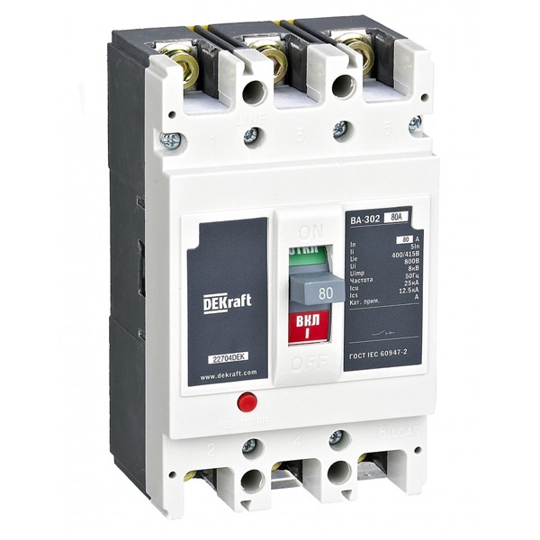 Автоматический выключатель в литом корпусе серии ВА-301L DEKraft; 3P; номинальный ток 50 А; откл. способность Icu = 25 kA (при 400 В пер.тока); уставка мгновенного срабатывания Ii = 5In. В комплект поставки входят 4 межфазные перегородки и крепеж на монтажной плате. Выключатели имеют компактный размер (на 10-15% меньше по сравнению с аналогами), что экономит место в распределительном щите. Уставка срабатывания 5хIn обеспечивает чувствительность к токам КЗ в конце линий большой длины.