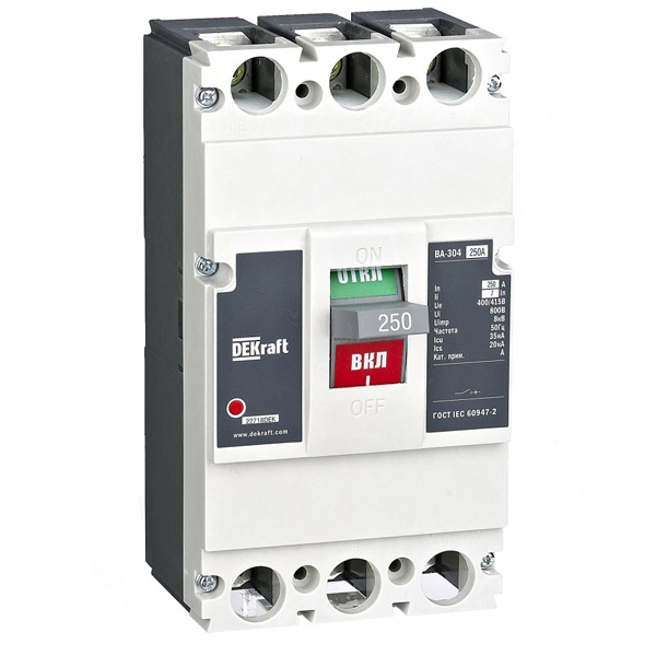 Автоматический выключатель в литом корпусе серии ВА-303L DEKraft; 3P; номинальный ток 200 А; откл. способность Icu = 35 kA (при 400 В пер.тока); уставка мгновенного срабатывания Ii = 7In. В комплект поставки входят 4 межфазные перегородки и крепеж на монтажной плате. Выключатели предназначены для распределения электроэнергии и защиты от перегрузок, КЗ и понижения напряжения. Они имеют компактный размер (на 10-15% меньше по сравнению с аналогами), что экономит место в распределительном щите.