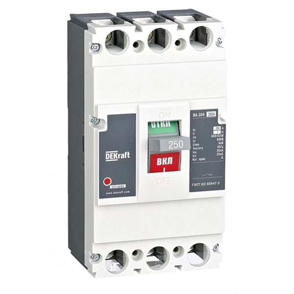 Автоматический выключатель в литом корпусе серии ВА-303L DEKraft; 3P; номинальный ток 350 А; откл. способность Icu = 35 kA (при 400 В пер.тока); уставка мгновенного срабатывания Ii = 5In. В комплект поставки входят 4 межфазные перегородки и крепеж на монтажной плате. Выключатели имеют компактный размер (на 10-15% меньше по сравнению с аналогами), что экономит место в распределительном щите. Уставка срабатывания 5хIn обеспечивает чувствительность к токам КЗ в конце линий большой длины.