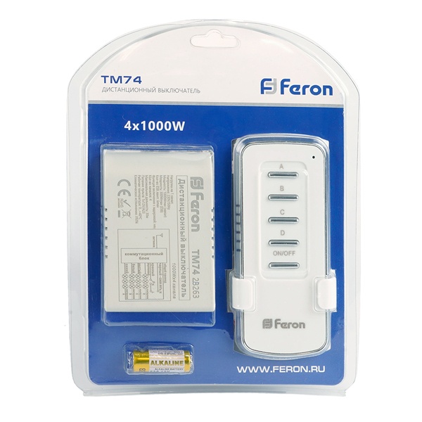 Дистанционный выключатель для светильников (4-х канальный ), FERON TM74, IP20, 230V, 1000W, 300W цвет белый, 100*55*25мм