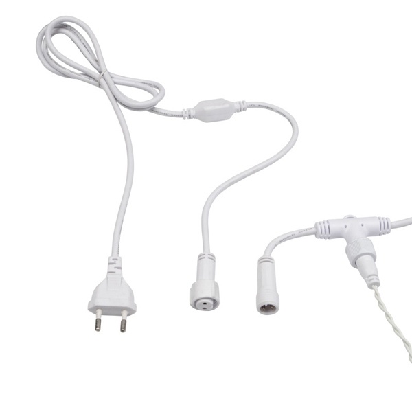 Гирлянда "Светодиодный Дождь" представляет собой гибкий горизонтальный шнур-шину (2м), к которому через определенные промежутки крепятся вертикальные нити (20 шт.) со светодиодными лампами, которые отличаются от «Бахромы» тем, что имеют одинаковую, достаточно значительную длину, часто превышающую протяженность шины. На концах каждой шины есть разъем и штепсель, которые предназначены для последовательного соединения нескольких световых дождей в большой занавес ПЛЕЙ-ЛАЙТ. Используя занавес, можно не только создавать красивые световые занавесы или оформлять различные плоскости, например, фасады домов, окна и т.д., но и украшать объемные объекты.