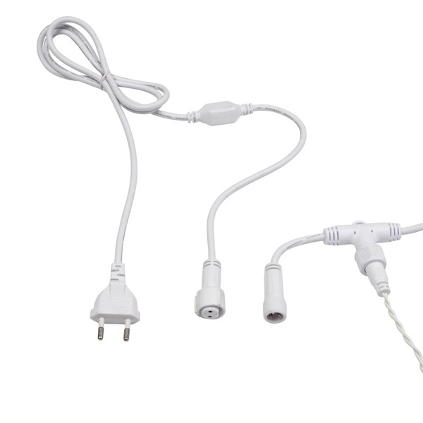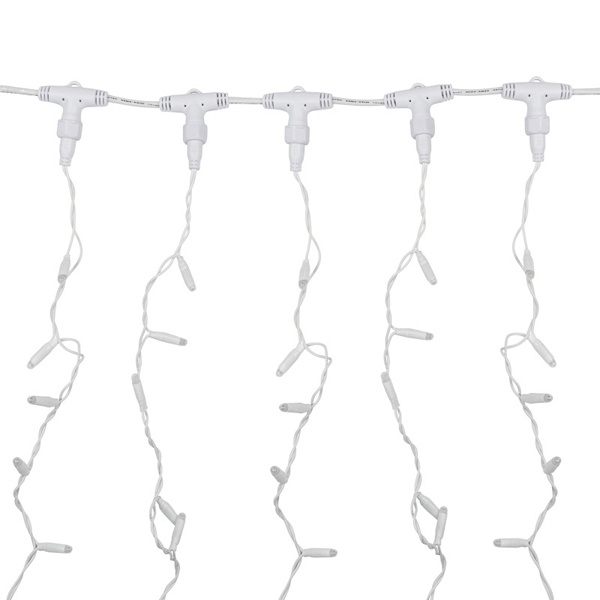 Гирлянда светодиодная «Дождь» представляет собой гибкий горизонтальный шнур-шину (2 м), к которому через определенные промежутки крепятся вертикальные нити (20 шт.) со светодиодными лампами, которые отличаются от «Бахромы» тем, что имеют одинаковую, достаточно значительную длину, часто превышающую протяженность шины. На концах каждой шины есть разъем и штепсель, которые предназначены для последовательного соединения нескольких световых «Дождей» в большой занавес «Плей-Лайт». Используя занавес, можно не только создавать красивые световые занавесы или оформлять различные плоскости, например, фасады домов, окна и т. д., но и украшать объемные объекты. Гирлянду, работающую в непрерывном свечении, называют фиксинг, а использующую режим светодинамики – чейзинг. Светодинамические эффекты становятся доступными только при подключении гирлянды к сети через специальный контроллер. Сегодня в гирляндах источником света служат светодиоды, которые пришли на смену применявшимся ранее лампам накаливания. С полупроводниковыми источниками гирлянда стала более надежной, потребляет меньше энергии, обрела более насыщенное сияние. Данная гирлянда имеет теплый белый цвет свечения светодиодов.