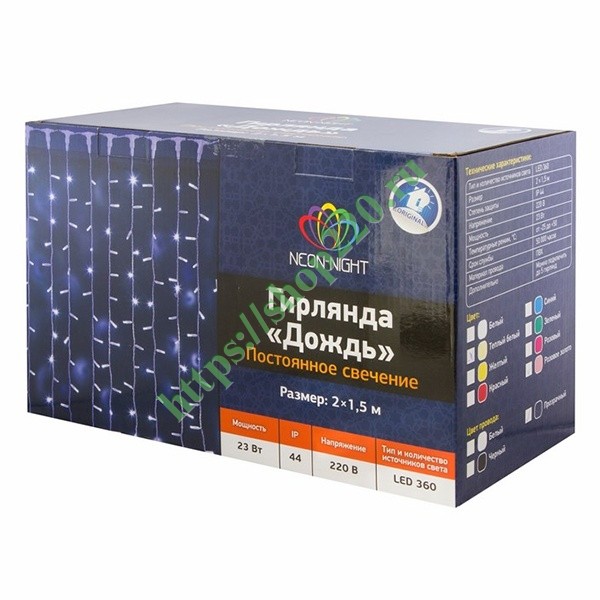 Гирлянда "Светодиодный Дождь" ("Занавес") представляет собой гибкий горизонтальный шнур-шину (2м), к которому через определенные промежутки крепятся вертикальные нити (20 шт.) равной длины (1,5 м) со светодиодами.