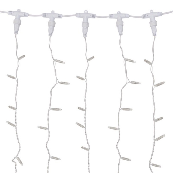 Гирлянда "Светодиодный Дождь" представляет собой гибкий горизонтальный шнур-шину (2м), к которому через определенные промежутки крепятся вертикальные нити (20 шт.) со светодиодными лампами, которые отличаются от «Бахромы» тем, что имеют одинаковую, достаточно значительную длину, часто превышающую протяженность шины. На концах каждой шины есть разъем и штепсель, которые предназначены для последовательного соединения нескольких световых дождей в большой занавес ПЛЕЙ-ЛАЙТ необходим шнур 303-500-1. Используя занавес, можно не только создавать красивые световые занавесы или оформлять различные плоскости, например, фасады домов, окна и т.д., но и украшать объемные объекты.