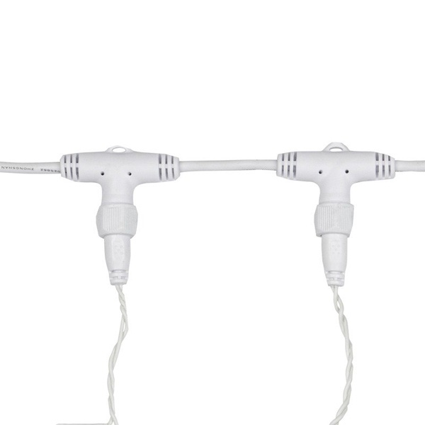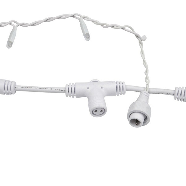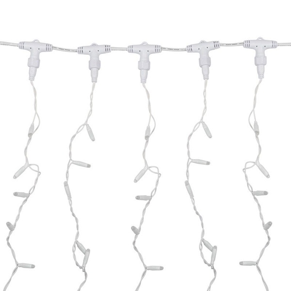 Гирлянда светодиодная «Дождь» представляет собой гибкий горизонтальный шнур-шину (2 м), к которому через определенные промежутки крепятся вертикальные нити (20 шт.) со светодиодными лампами, которые отличаются от «Бахромы» тем, что имеют одинаковую, достаточно значительную длину, часто превышающую протяженность шины. На концах каждой шины есть разъем и штепсель, которые предназначены для последовательного соединения нескольких световых «Дождей» в большой занавес «Плей-Лайт». Используя занавес, можно не только создавать красивые световые занавесы или оформлять различные плоскости, например, фасады домов, окна и т. д., но и украшать объемные объекты. Гирлянду, работающую в непрерывном свечении, называют фиксинг, а использующую режим светодинамики – чейзинг. Светодинамические эффекты становятся доступными только при подключении гирлянды к сети через специальный контроллер. Сегодня в гирляндах источником света служат светодиоды, которые пришли на смену применявшимся ранее лампам накаливания. С полупроводниковыми источниками гирлянда стала более надежной, потребляет меньше энергии, обрела более насыщенное сияние. Данная гирлянда имеет теплый белый цвет свечения светодиодов.