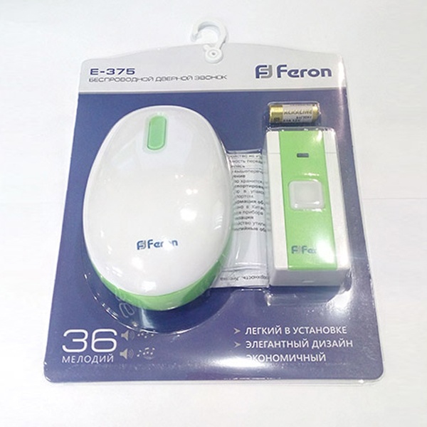Звонок электрический дверной беспроводной FERON E-375, 36 мелодий, дальность действия 80м, цвет белый/зеленый, регулировка громкости - есть, шифрование сигнала - нет; БАЗА: 2*1,5V/AA, 40*75*120 мм, КНОПКА: IP20, 12V 23A*1 (в комплекте) , раб.t -20..+70С , размер кнопки 35*75*25мм