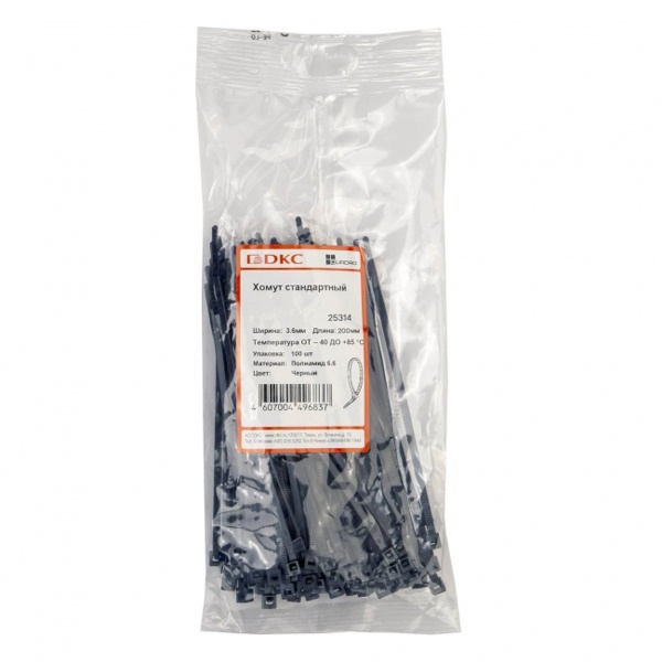 25314 Хомут P6.6 стандартный черный 3,6х200 мм [упаковка 100шт] DKC