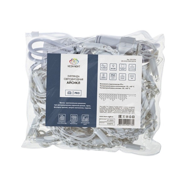 Уличная гирлянда Айсикл (бахрома) светодиодный, 2,4 х 0,6 м, белый провод, 230 В, 88 LED, белая NEON-NIGHT 255-034