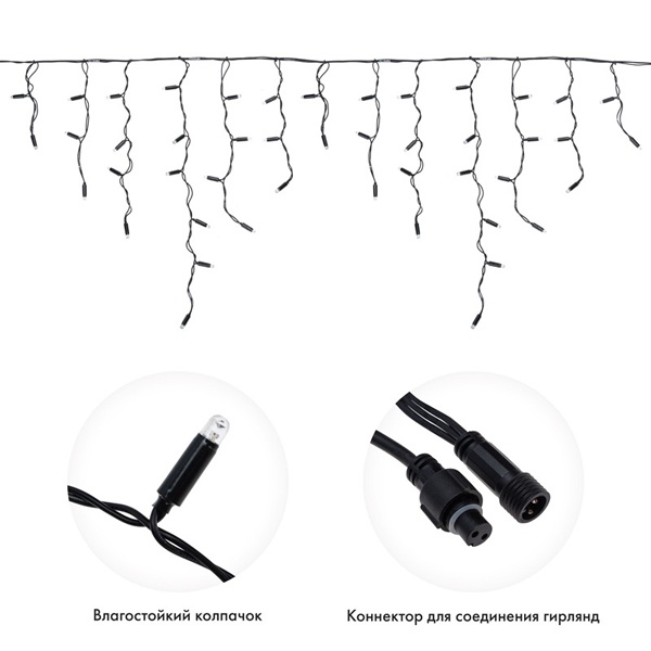 Благодаря использованюя в гирлянде светодиодов, ее отличительной особенностью является превосходная яркость и низкое энергопотрбление по сравнению с лампами накаливания.