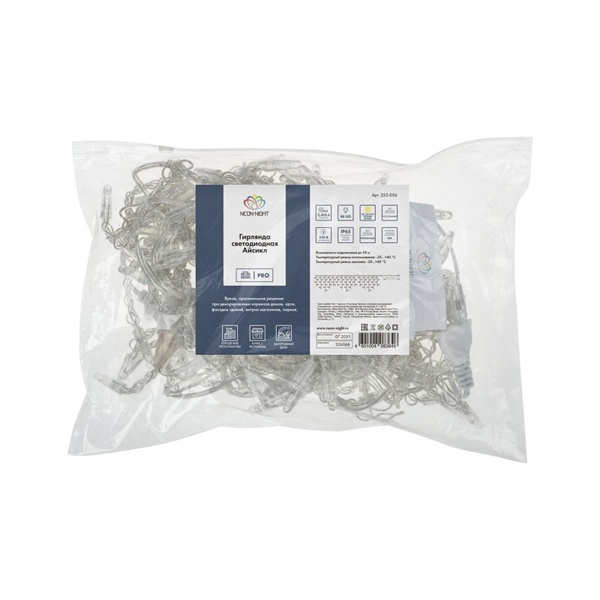 Гирлянда "Бахрома" ("Айсикл") представляет собой гибкий горизонтальный шнур-шину, к которому через определенные промежутки крепятся вертикальные нити разной длины со светодиодами. Она имитирует сосульки и может послужить эффектным и оригинальным решением при декорировании карнизов домов, арок, фасадов зданий, витрин магазинов, а также стать элементов декора внутренних интерьеров помещений.