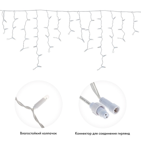 Данная гирлянда имеет Теплый белый цвет свечения и предназначена для использования как внутри помещения, так и снаружи.