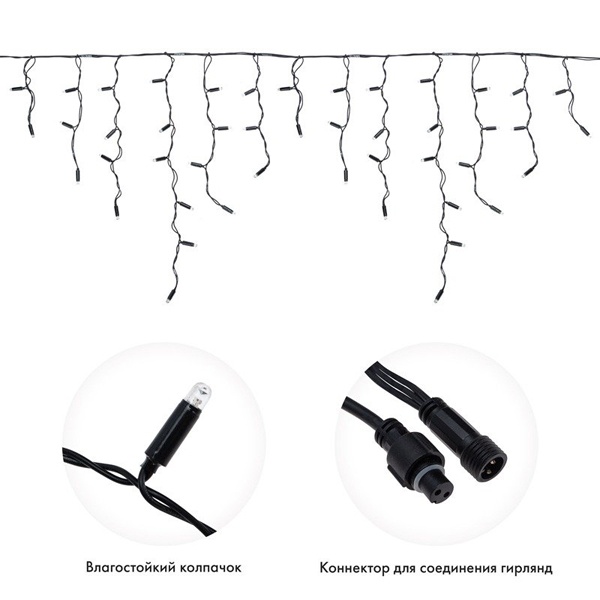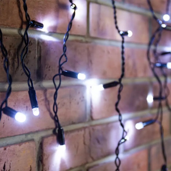 Гирлянда "Бахрома" ("Айсикл") представляет собой гибкий горизонтальный шнур-шину, к которому через определенные промежутки крепятся вертикальные нити разной длины со светодиодами. Она имитирует сосульки и может послужить эффектным и оригинальным решением при декорировании карнизов домов, арок, фасадов зданий, витрин магазинов, а также стать элементов декора внутренних интерьеров помещений.Благодаря использованюя в гирлянде светодиодов, ее отличительной особенностью является превосходная яркость и низкое энергопотрбление по сравнению с лампами накаливания.При длине 4,8 метра гибкая направляющая имеет 48 вертикальных нити от 20 до 60 см.Данная гирлянда имеет Белый цвет свечения. Ее особенностью является наличие мерцающих светодиодов Белого цвета, которые привлекают внимание и значительно преображают украшенную поверхность (мерцает каждый пятый светодиод).Гирлянда предназначена для использования как внутри помещения, так и снаружи.