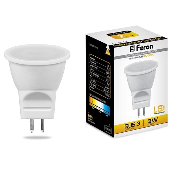 Лампа светодиодная FERON LB-271, MR11 (рефлекторная), 3W 230V G5.3 2700К (белый теплый), рассеиватель матовый белый, 260Lm, угол рассеивания 120, 42*35мм