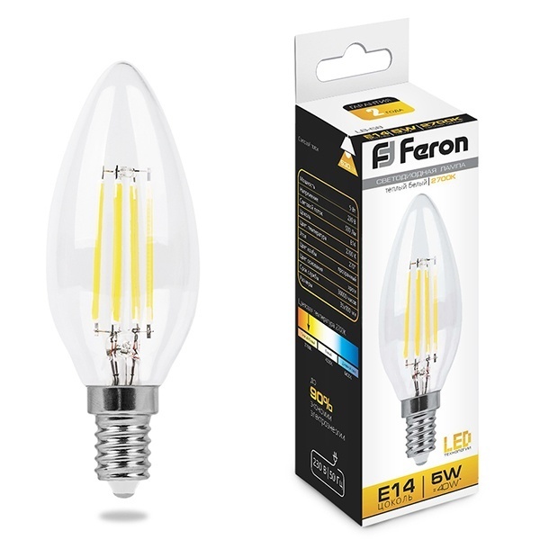 Лампа светодиодная филамент FERON LB-58, C35 (свеча), 5W 230V E14 2700К (белый теплый), рассеиватель прозрачный 530Lm, угол рассеивания 270, 100*35мм