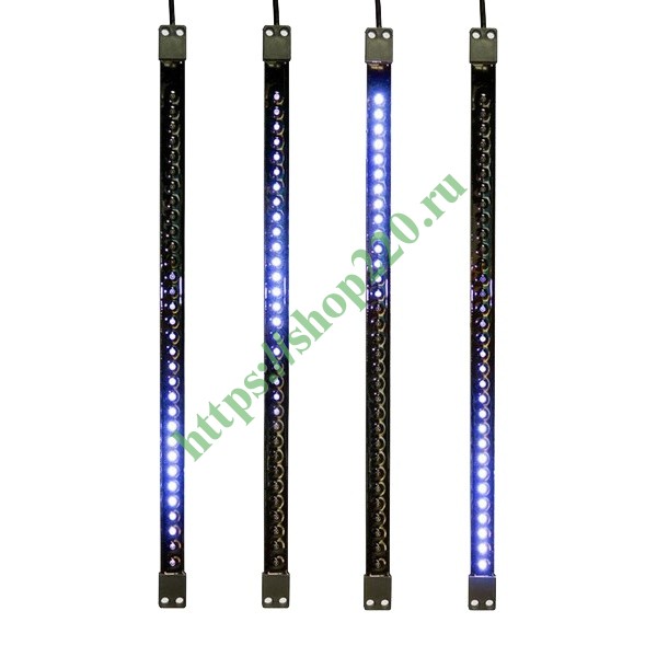 Она представляет собой прямоугольную трубку длиной 50 см в пластиковом корпусе чёрного цвета. Внутри надежно закреплена двусторонняя тонкая плата со светодиодами и микрочипом, обеспечивающим динамику с эффектом стекающей капли. Гирлянда работает от напряжения 9,5 V и имеет влагозащищённое исполнение, что позволяет безопасно использовать её как в помещении, так и на улице.