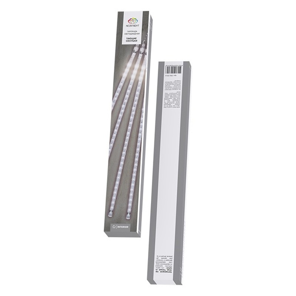 Светодиодная гирлянда «Тающие сосульки» - это оригинальное, красивое и современное средство оформления фасадов и интерьеров зданий, деревьев, витрин и т.д. Она представляет собой комплект из 8 прозрачных пластиковых трубок, расположенных на расстоянии 50 см друг от друга. По всей длине каждой трубки внутри надежно закреплена плата со светодиодами и микрочипом, обеспечивающим динамику с эффектом стекающей капли. Длина каждой трубки 50 см, диаметр 12 мм. Гирлянда работает от напряжения 24 V и имеет влагозащищённое исполнение, что позволяет безопасно использовать её как в помещении, так и на улице. Адаптер для подключения идёт в комплекте с гирляндой.